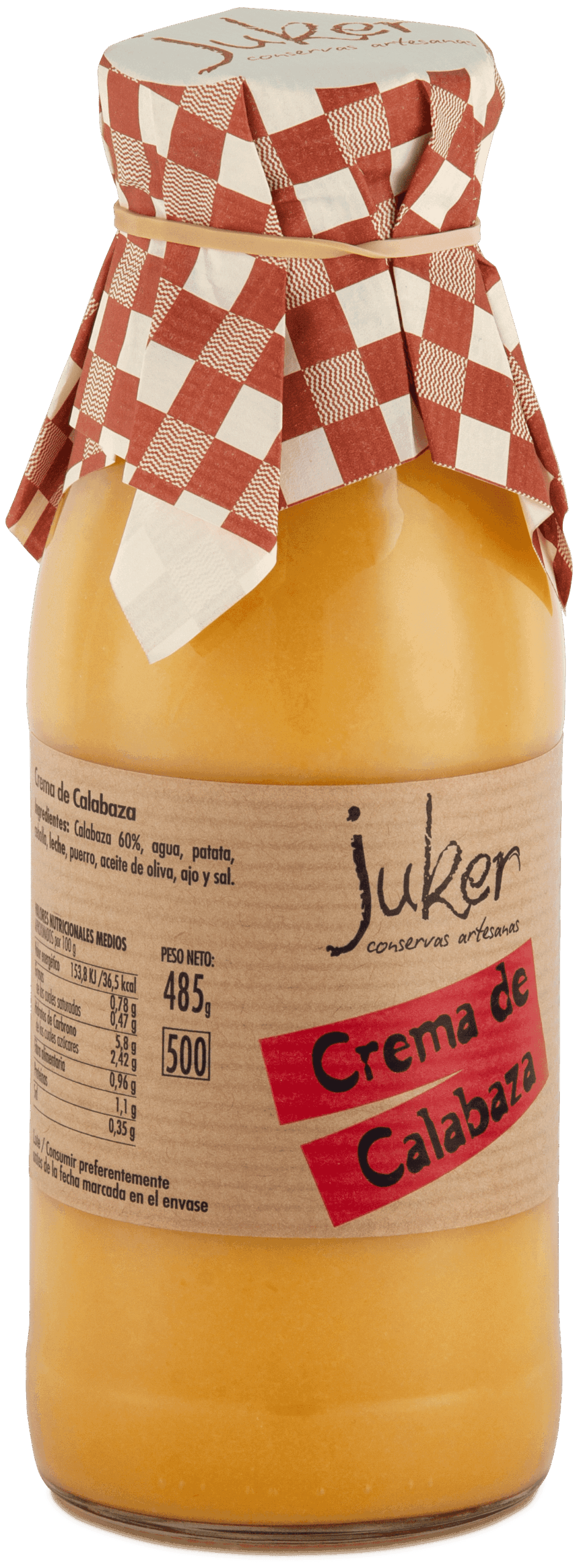 Ingredientes: calabaza 60%, agua, patata, cebolla, leche, puerro, queso fundido (leche desnatada concentrada, queso, grasa de leche, sales fundentes (polifosfatos, fosfato de calcio, citratos de sodio, ácido cítrico), proteína de leche, sal, conservadores (sorbato potásico, nisina)), ajo y sal.